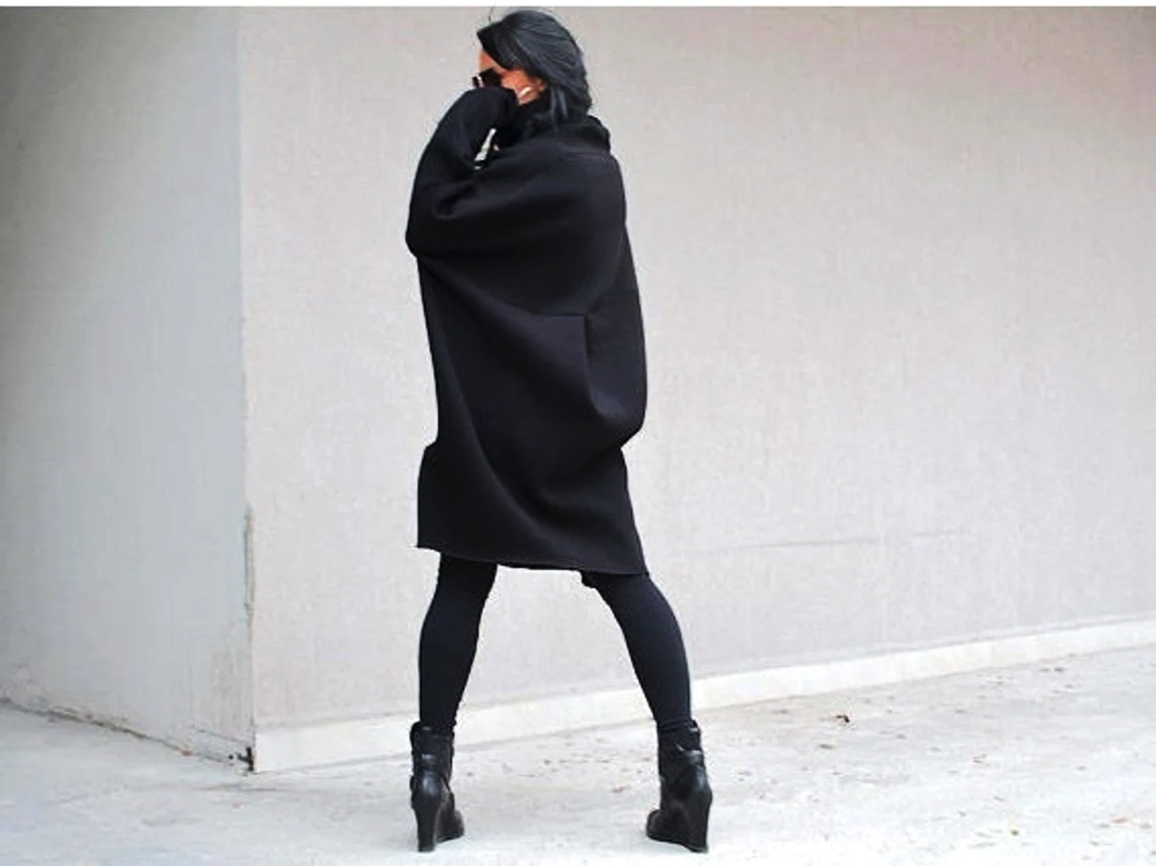 Tailored Maxi Blouse Cotton Maxi Blouse Asymmetrical Poncho Soft Sweater Maternity Sweater Extra Long Sleeves Designer Tunic Turtleneck Collar Stylish Sweater Black Poncho Black Friday High Neck Pullover Turtleneck Tunic