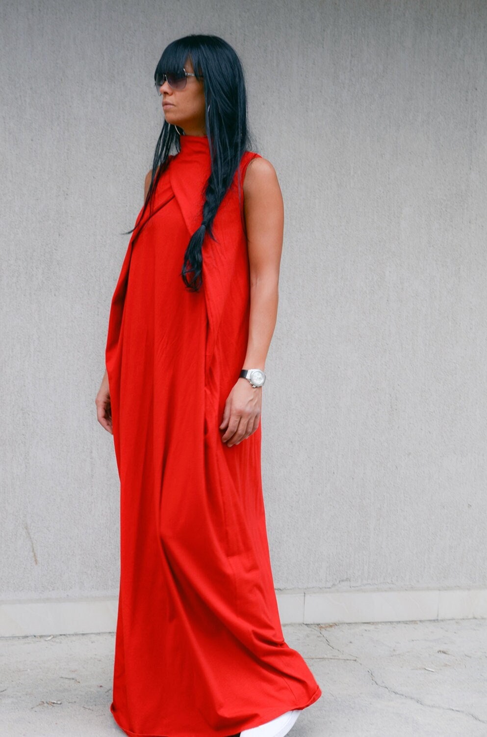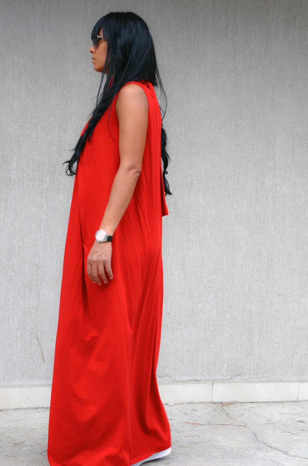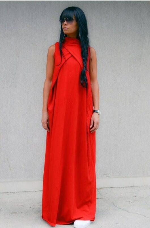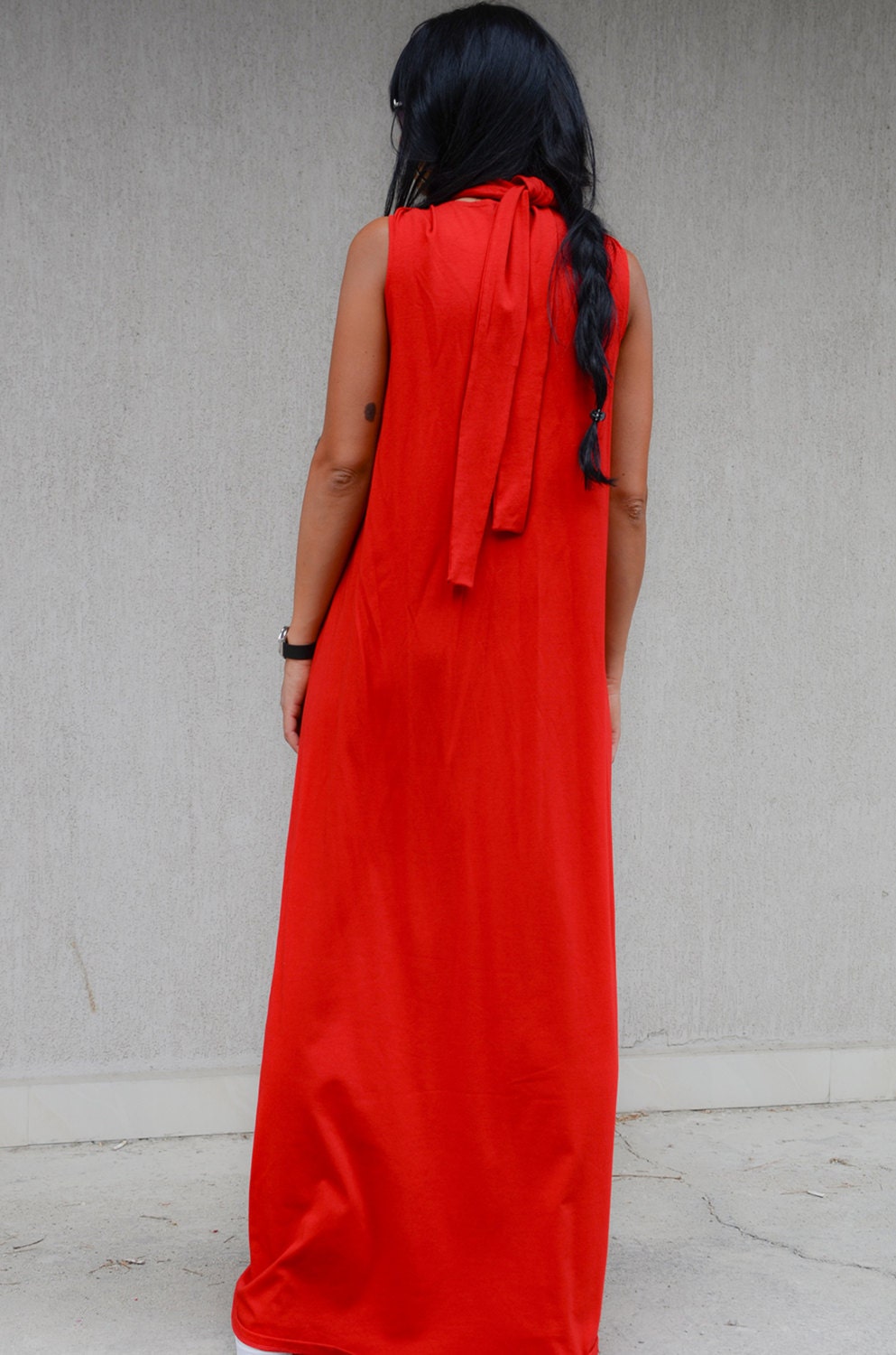 Jersey sleeveless red dress. Full length design loose fit and semi open back. Designed with two symmetrical triangle plates turned into the straps at the end. You can tie them in beautiful ribbon both at front and at the back.
