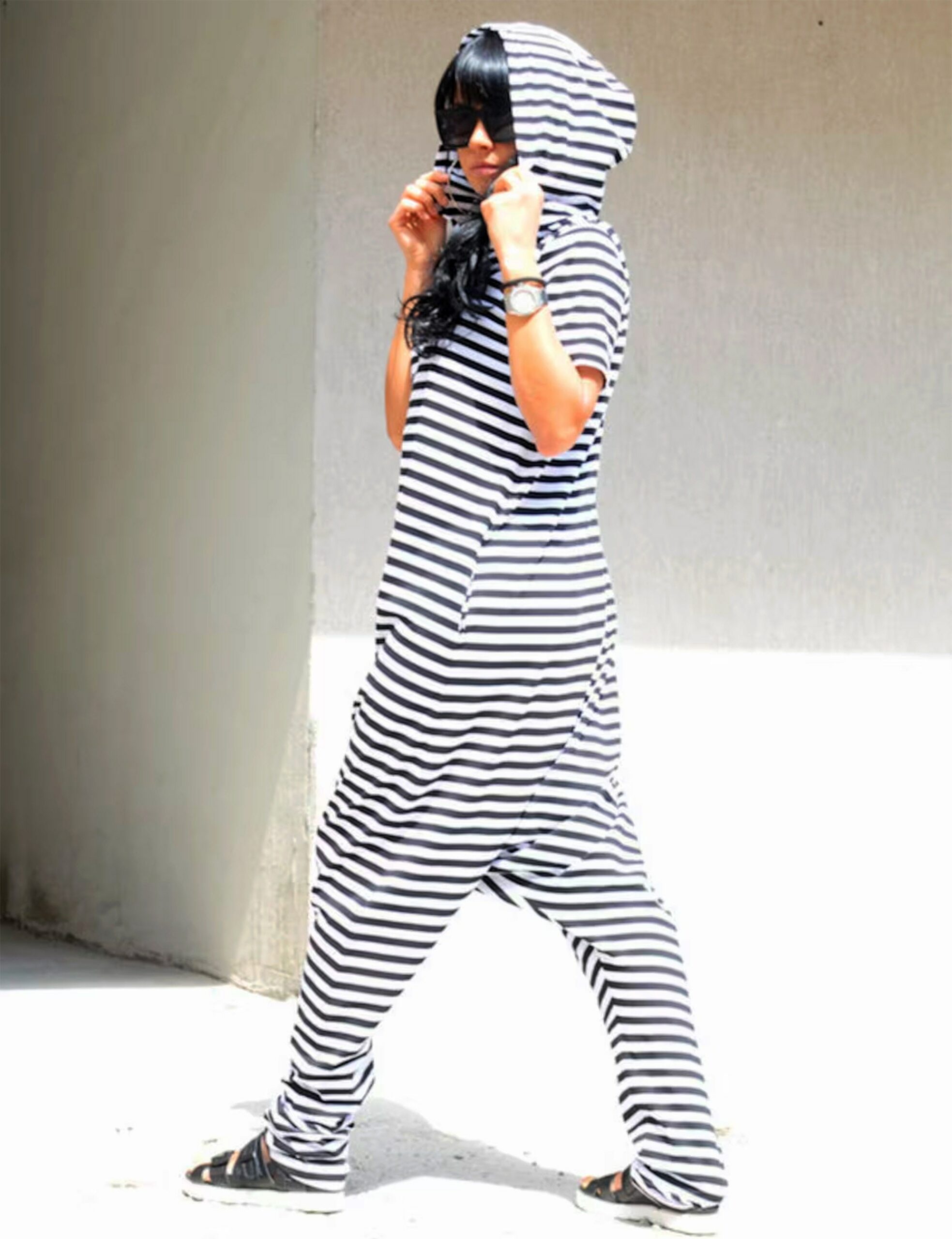 🌐🌐🌐 DHL EXPRESS SHIPPING 🌐🌐🌐Zipped Low Crotch Summer Maternity Romper, Loose Striped Harem Jumpsuit with Short Sleeves, Comfortable Maxi Harem Overall with Hood, Comfy